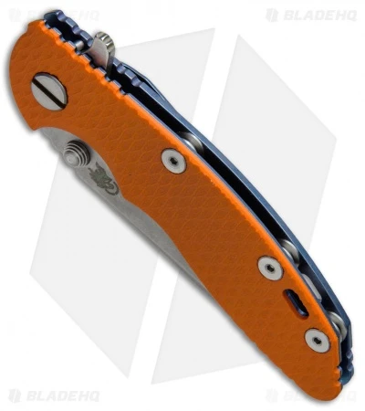 The Hinderer XM folder features an ergonomic design and solid build. This Hinderer XM-18 folder has a tumbled 3″ spear point blade with flipper. It has an orange G-10 scale and a blue anodized titanium frame lock.