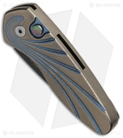 - Bronze and blue anodized titanium handle with an orange peel finish.