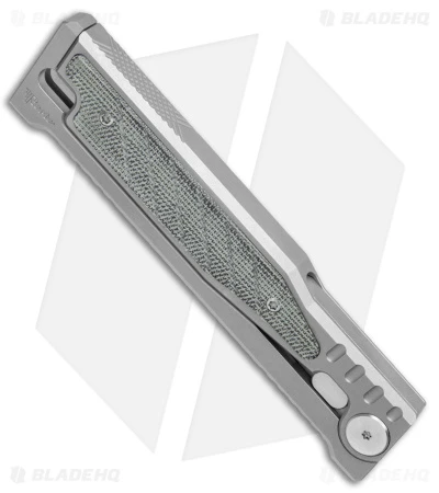 - Titanium handle with textured micarta scales in black.