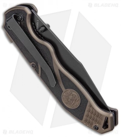 This Smith and Wesson Spring assisted knife has got a sweet bronze colored handle with black traction inlays for a secure grip and tactical look. The black coated clip point partially serrated blade is opened with thumb studs and a spring assist. This beefy knife is ready for action!