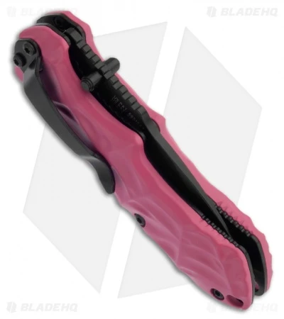 This Small Black Ops SWBLOP3SMP has a pink anodized aluminum handle and a black finished drop point blade with a plain cutting edge.
